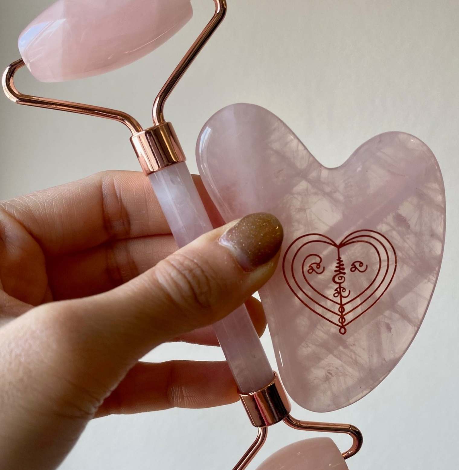 Rose Quartz Thai Yantra Gua Sha + Facial Roller Set